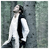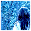 Description: the back of a long dark haired male standing in blue-toned woods looking away
