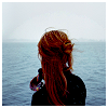Description: rear shot of a dark redhead with half-bound hair starin out at an ocean